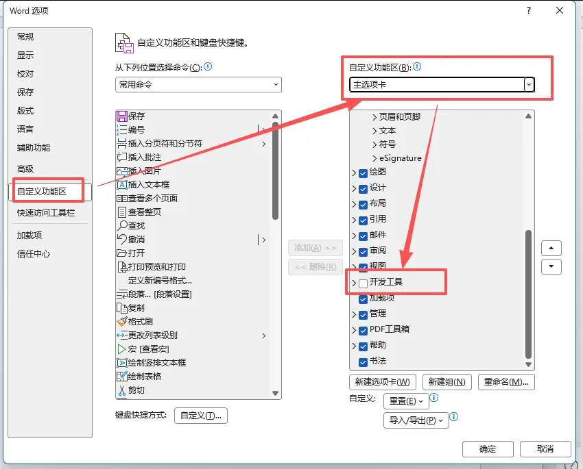 在弹出的窗口里,点击左边的「自定义功能区」,在右边的「自定义功能区」选项框往下拉,找到并把把「开发工具」前面的勾打上,点击「确定」