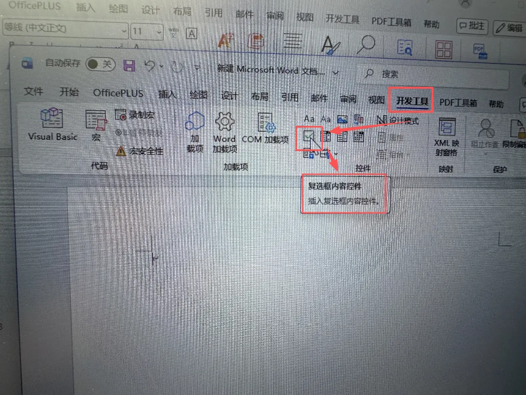 这时候Word上方就会出现「开发工具」选项卡,点击它,再点击「复选框内容控件」