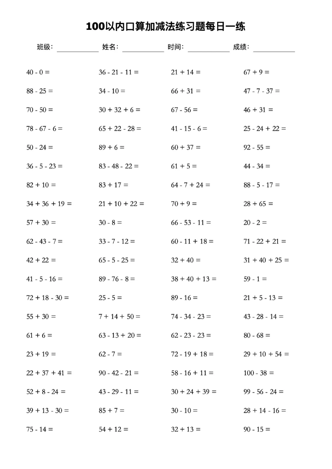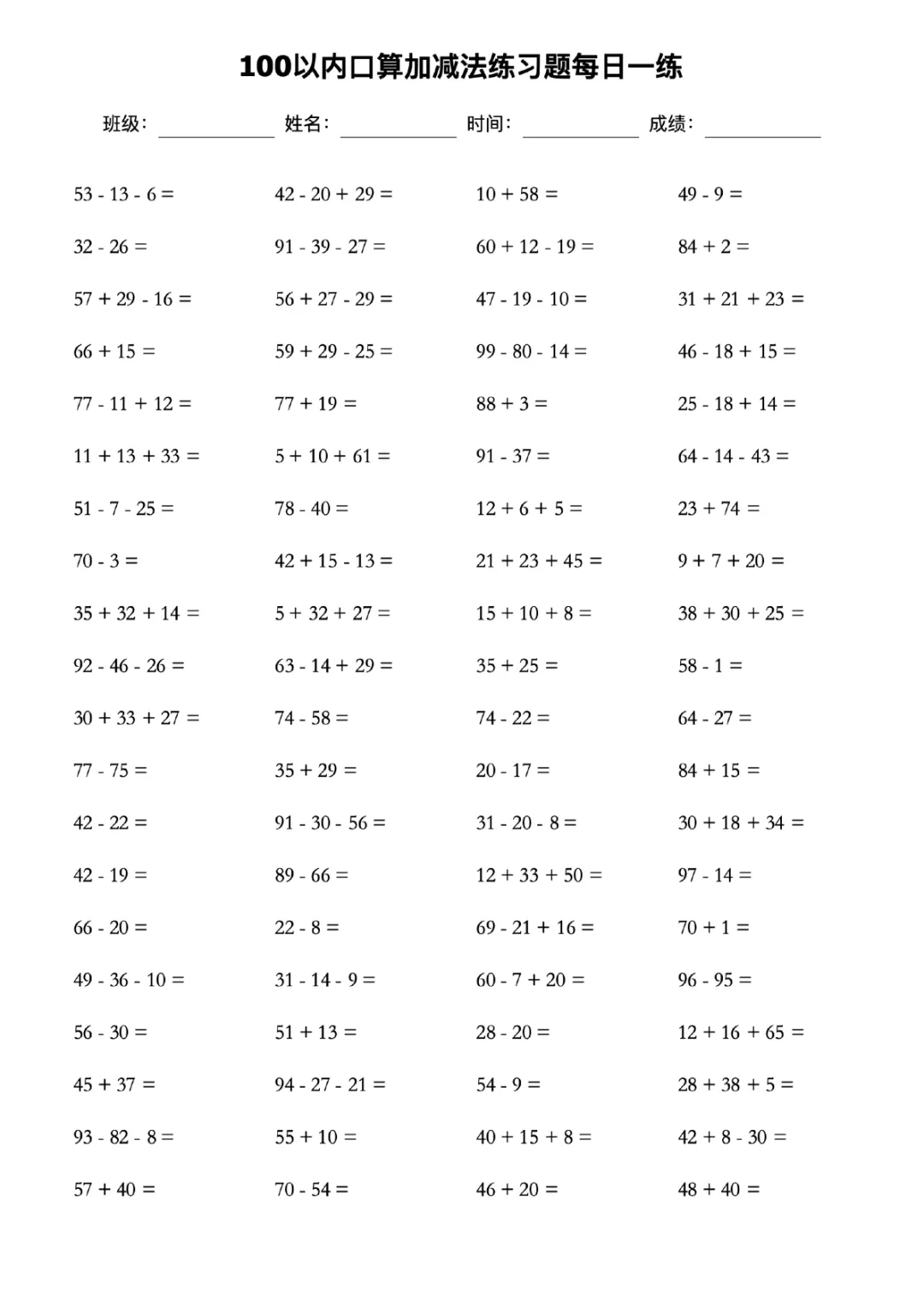 ✅ 内容涵盖加减法、连加连减、加减混合运算,题型丰富全面。