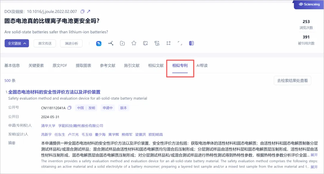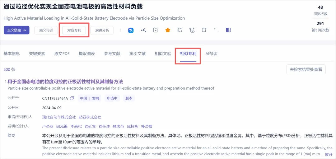 当看到让你眼前一亮的论文时,可以先用「对应专利」一键查看直接关联专利,再用「相似专利」拓展检索原理相近的外围专利。
