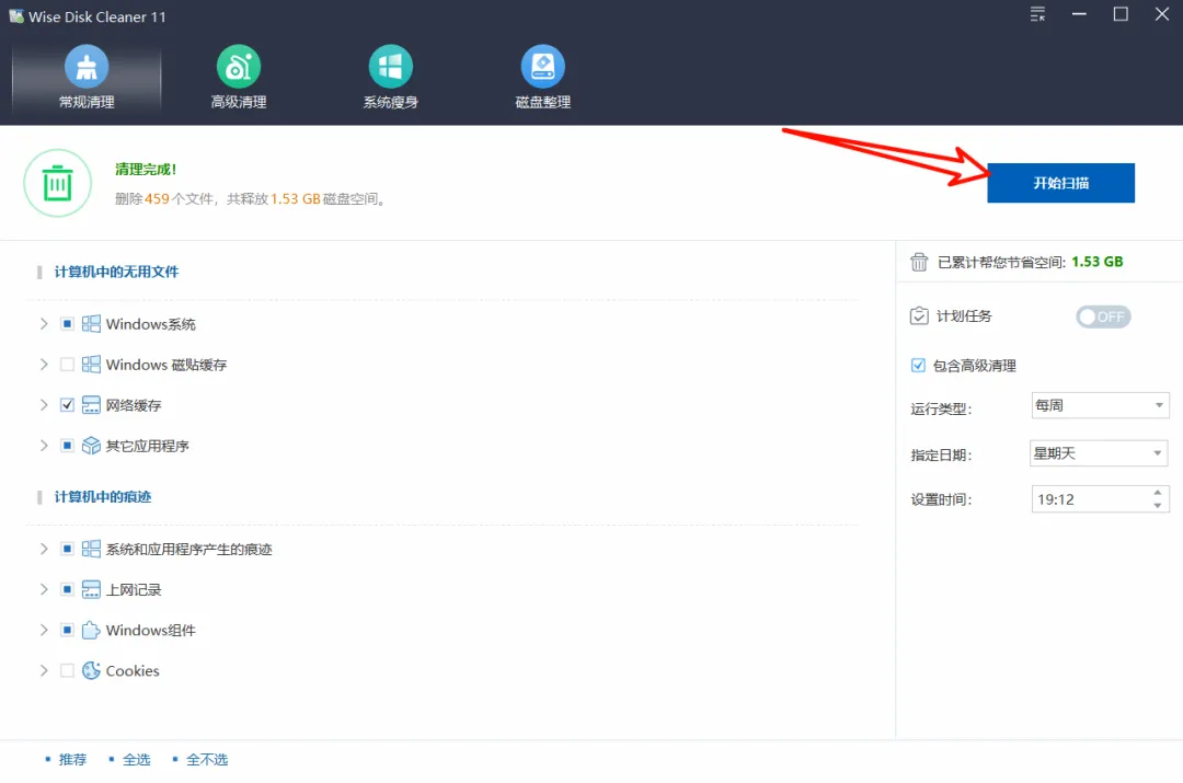 1. 常规清理:一键扫光系统垃圾打开软件后默认进入「常规清理」界面,这里会列出Windows 系统垃圾、网络缓存、应用程序残留、上网记录等选项。