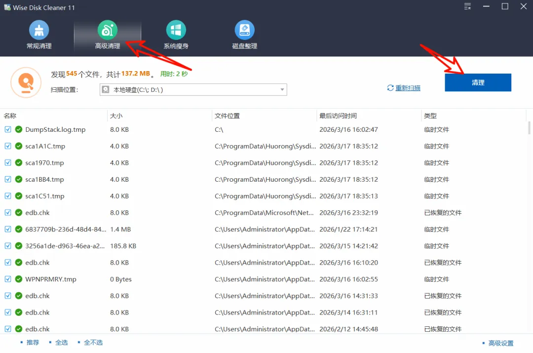 如果常规清理还不够,切换到「高级清理」标签。这里可以自定义扫描位置,比如单独清理 C 盘或 D 盘。