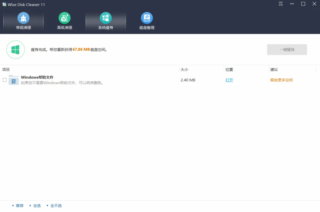 这些东西平时根本用不到,却占空间。勾选后点击「一键瘦身」,轻松给 C 盘减负。