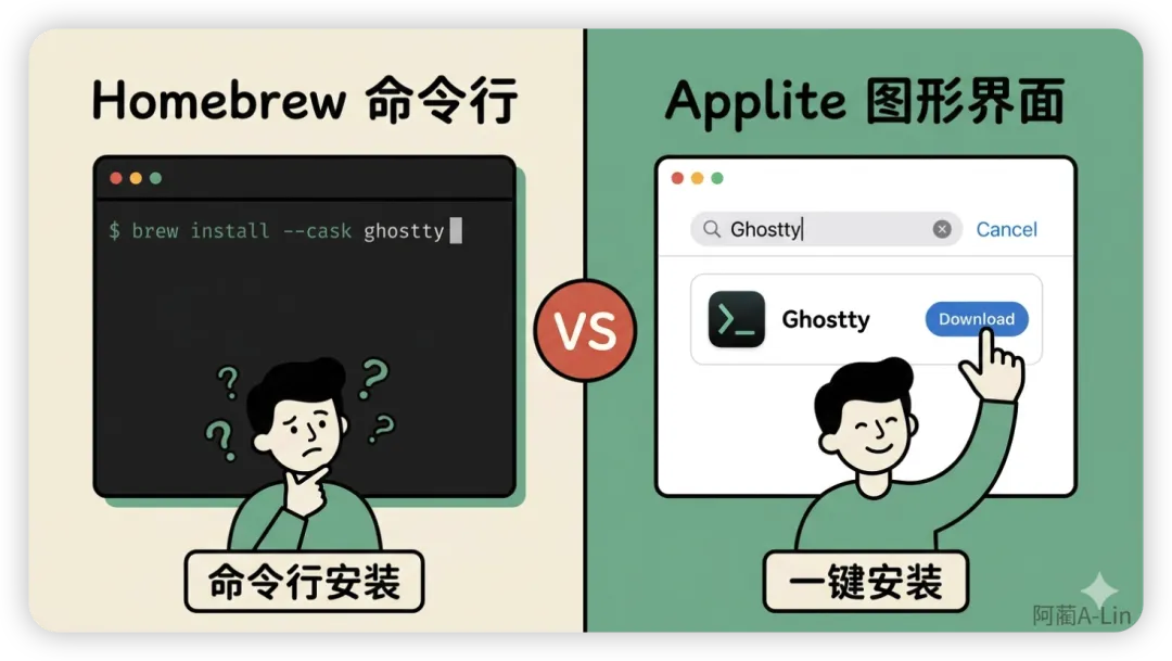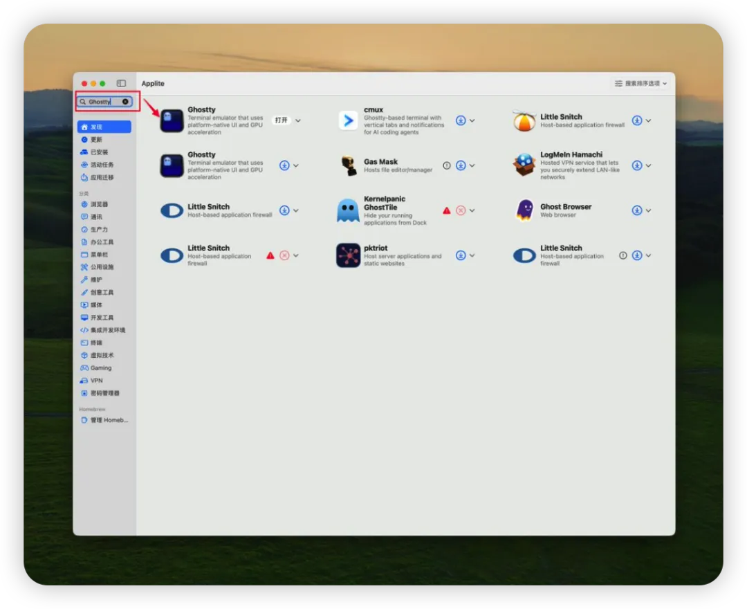 如果你是从 Ghostty 入门教程 过来的,现在应该能理解那篇文章里的 brew install 命令是怎么回事了。当然,你完全可以不敲那些命令,在 Applite 里点点鼠标就行。
