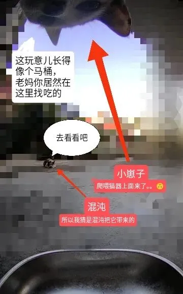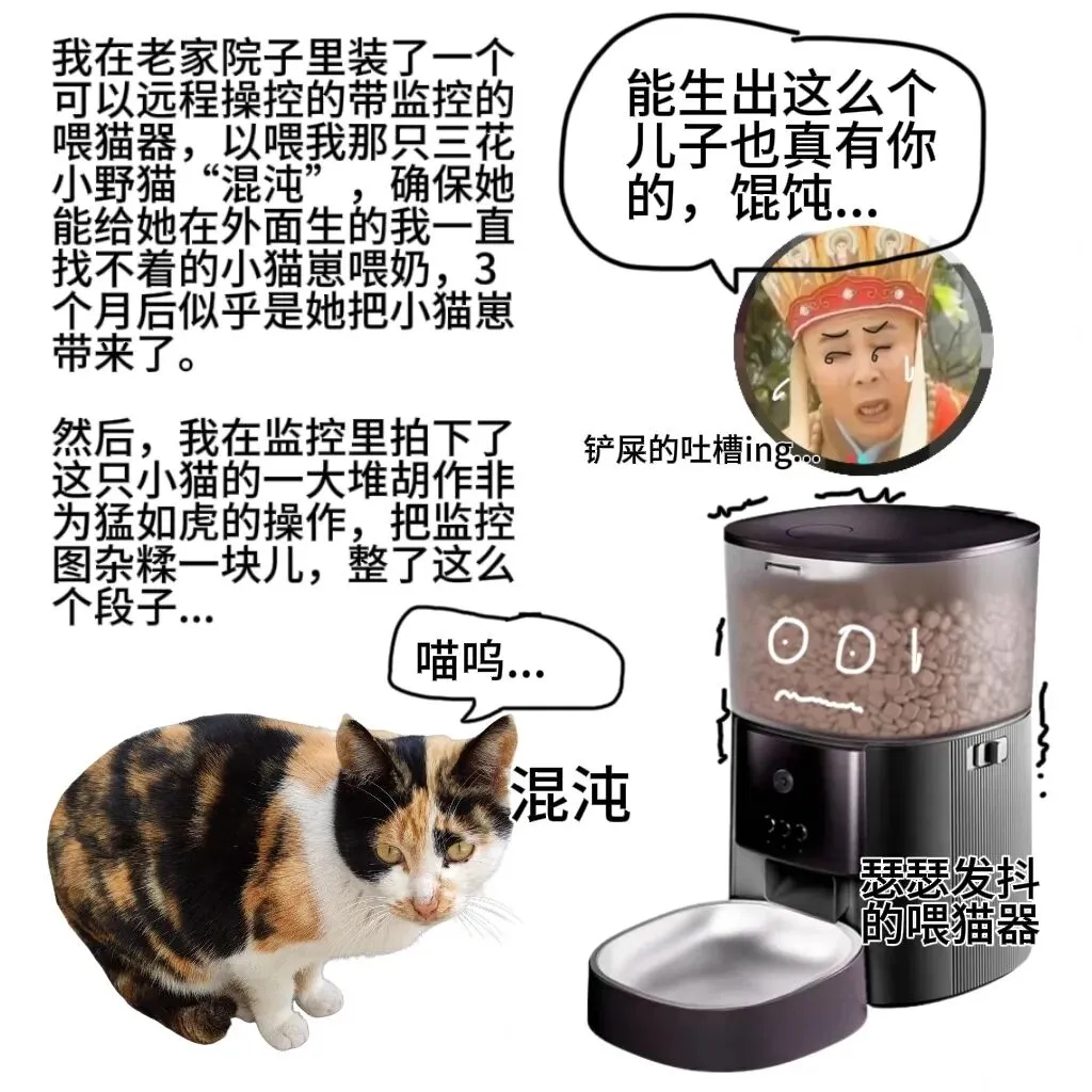 上一篇我们交代了混沌的小猫崽出现的前后经过,由于这家伙经常来我设置的喂猫器这边扒拉猫粮,被喂猫器的监控拍下了太多有趣好玩的照片,因此我突发奇想,把这些图杂糅成了一个漫画段子作为本篇内容供大家乐呵乐呵,那么我们直接开始吧~