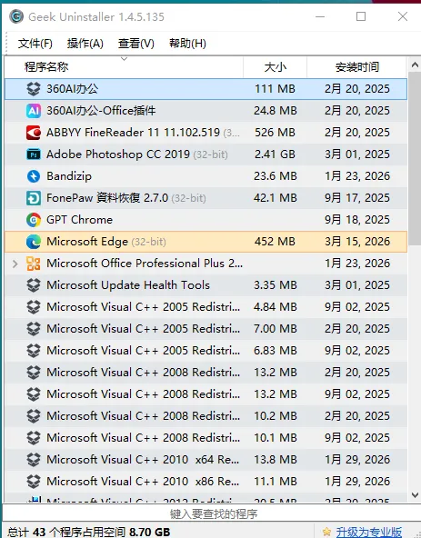 系统自带卸载工具经常删不干净,留下文件与注册表垃圾,Geek Uninstaller体积小巧、免安装、免费无广告,支持强制卸载、深度扫描残留、注册表清理,哪怕是顽固软件也能彻底删除,让系统保持干净。操作简单,右键即可卸载,适合日常软件管理。