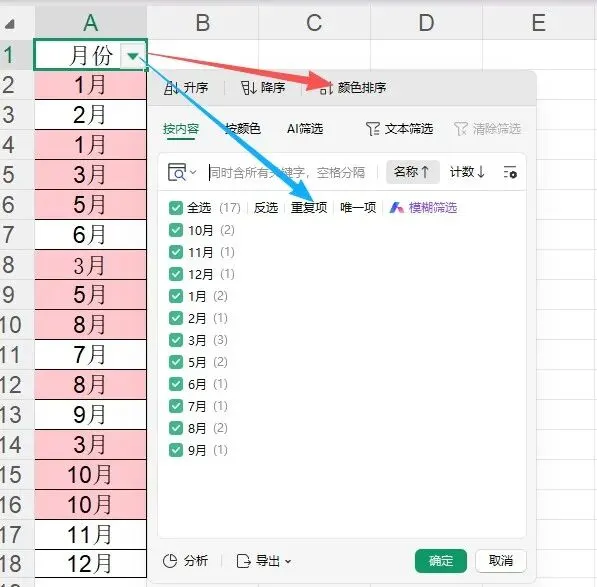 再点击A1单元格进行筛选,按“颜色”或者“重复值”都可以筛选出来。