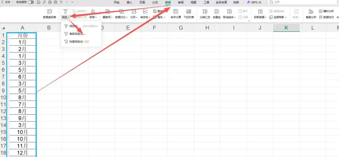选中需要筛选的数据区域(含表头)→点击【数据】→【高级】(Excel),如果是Wps,则是点击【数据】→【筛选】→【高级筛选】。