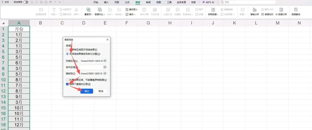 下一步,勾选【将筛选结果复制到其它位置】→【复制到框选空白区域如B1到B18→【选择不重复的记录】→【确定】。