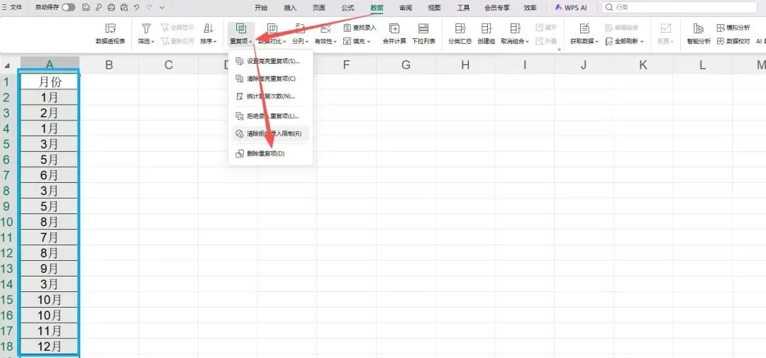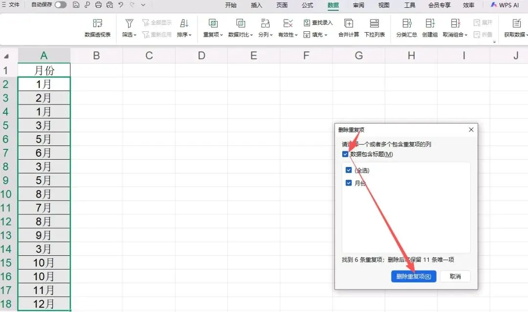 选中需要处理的数据区域(含表头)→点击【数据】→【删除重复项】(Excel),如果是Wps,则是点击【数据】→【重复项】→【删除重复项】。