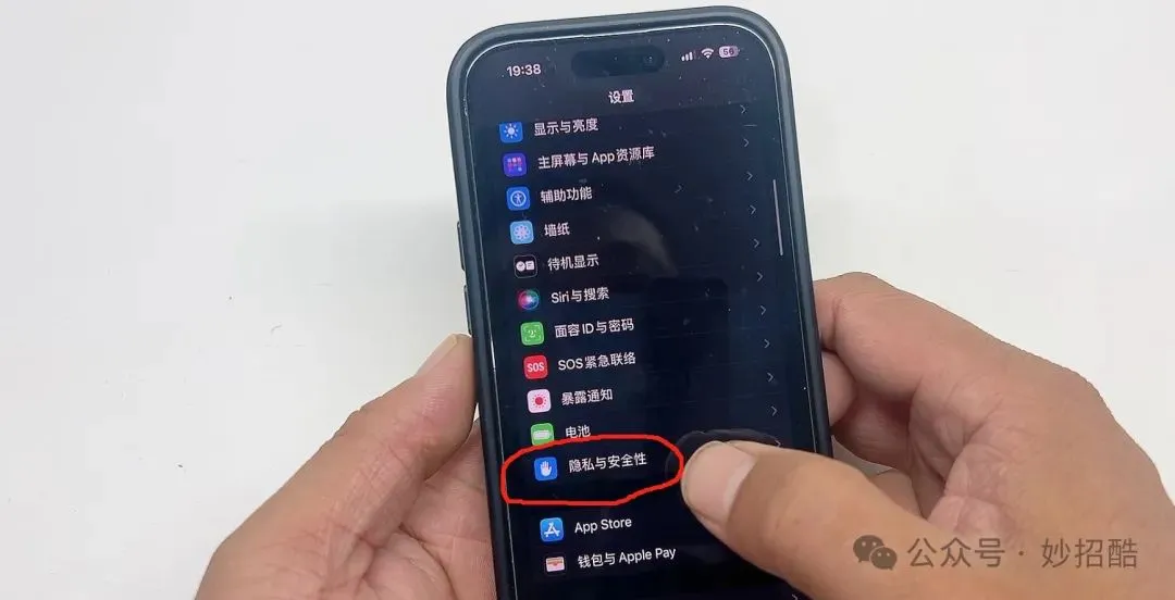 首先打开手机的设置,往下拉,找到隐私与安全,点进去。