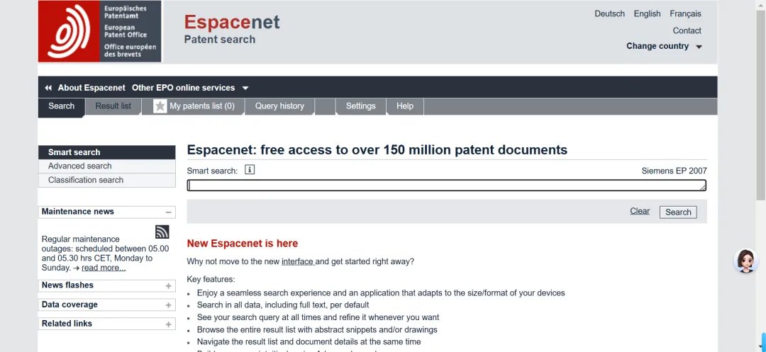 Espacenet是由欧洲专利局(EPO)开发的专利信息数据库,用户可通过该平台免费查阅来自全球80多个国家和地区的专利文献,其中绝大多数专利提供全文内容。