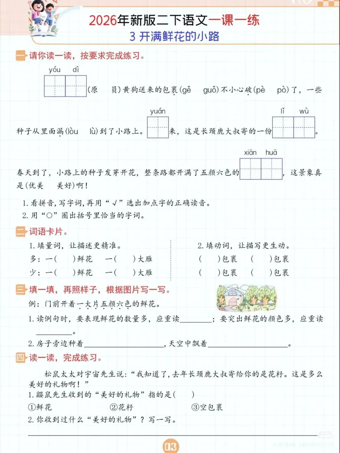 我翻了好久,终于找到一份特别全的。它是一课一练的形式,跟课本完全同步。里面内容真的挺扎实的,像看拼音写词语、选词填空这些基础练习都有,还有近义词反义词、句子仿写,甚至古诗和阅读理解也包含了,最后连每个单元的“语文园地”都没落下。