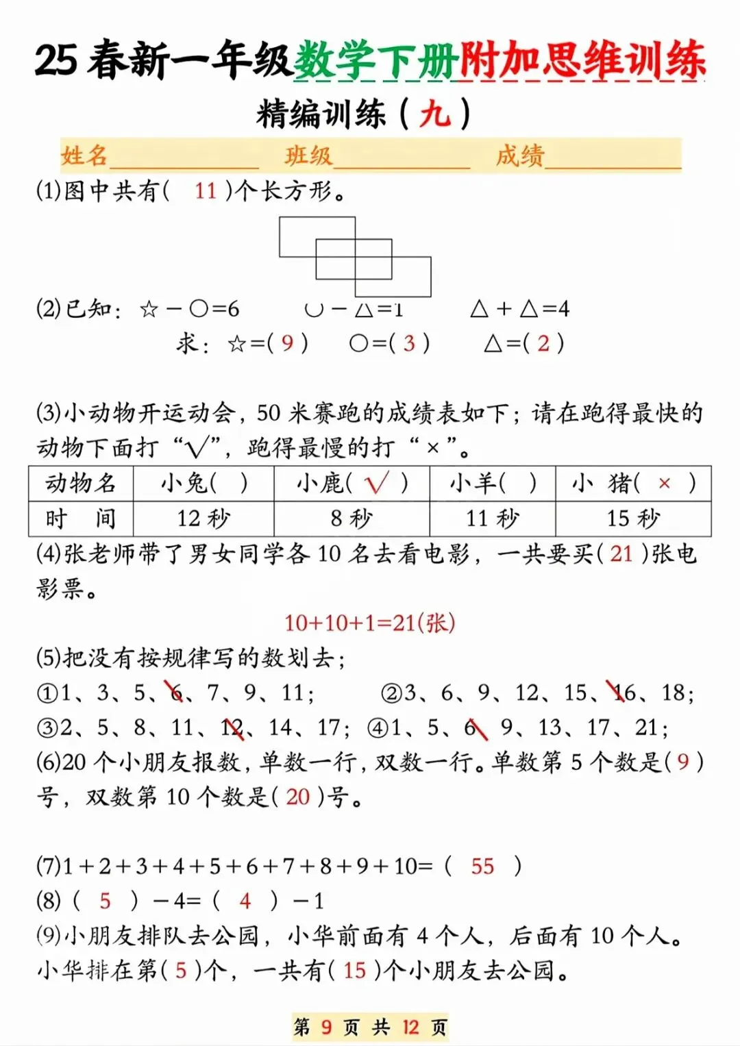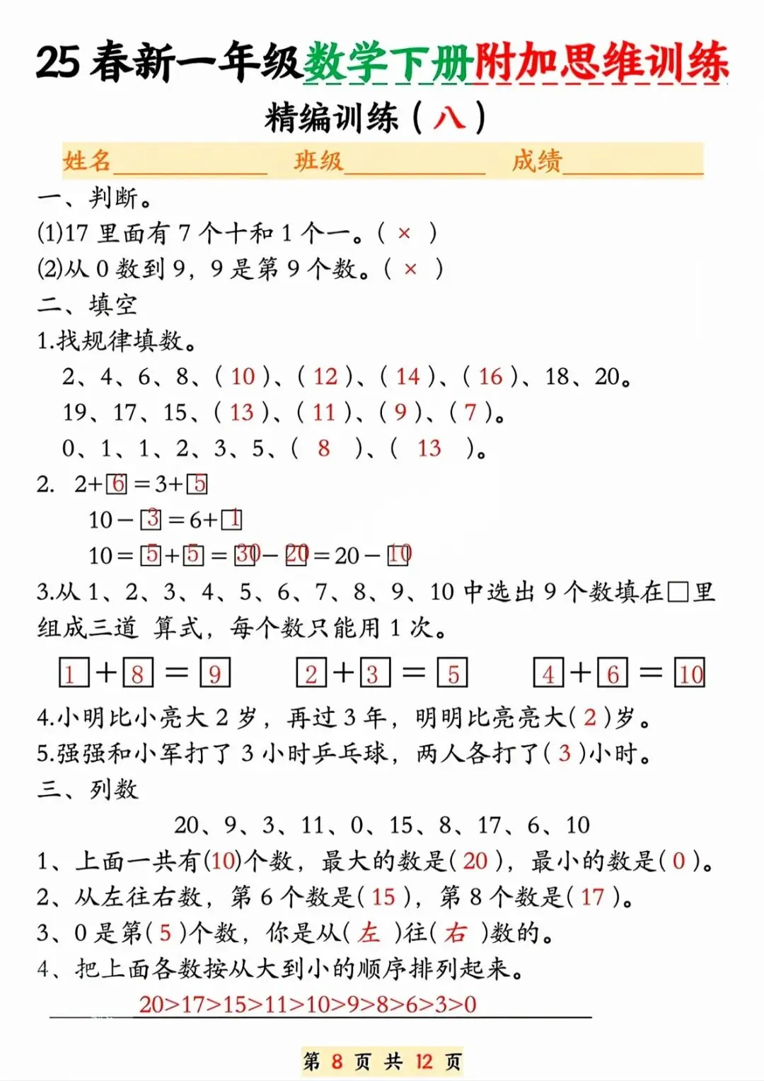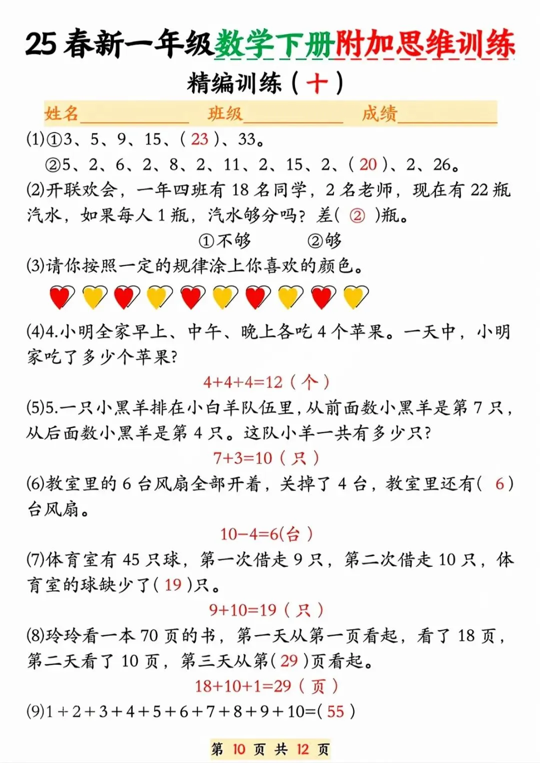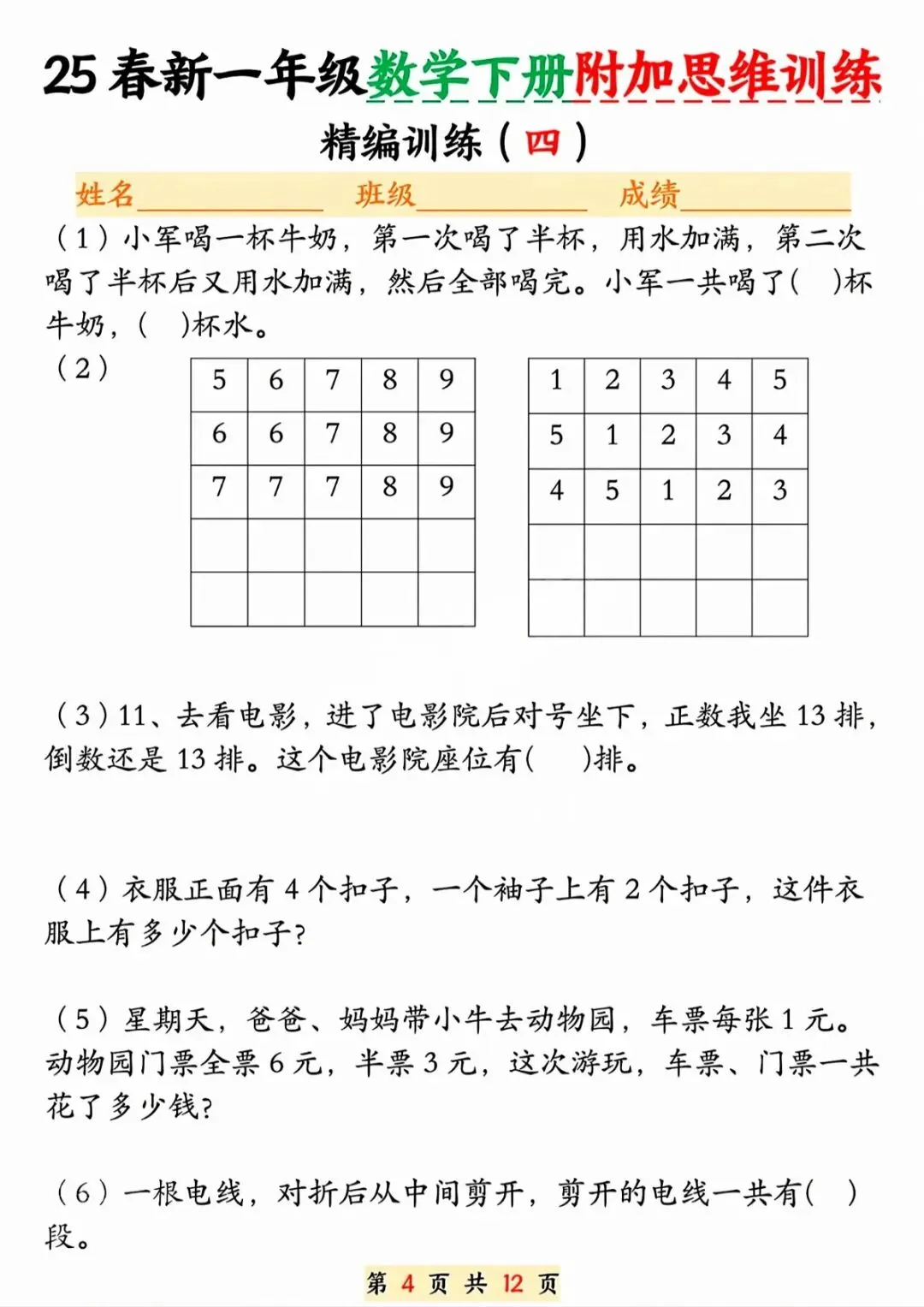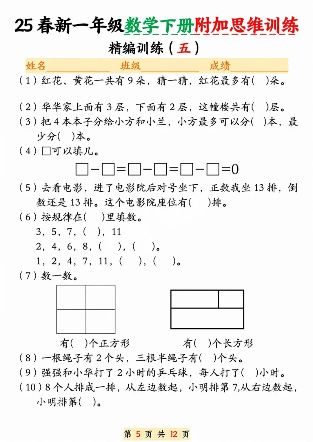 可下载丨26春一年级下册数学附加思维训练题,电子版可打印
