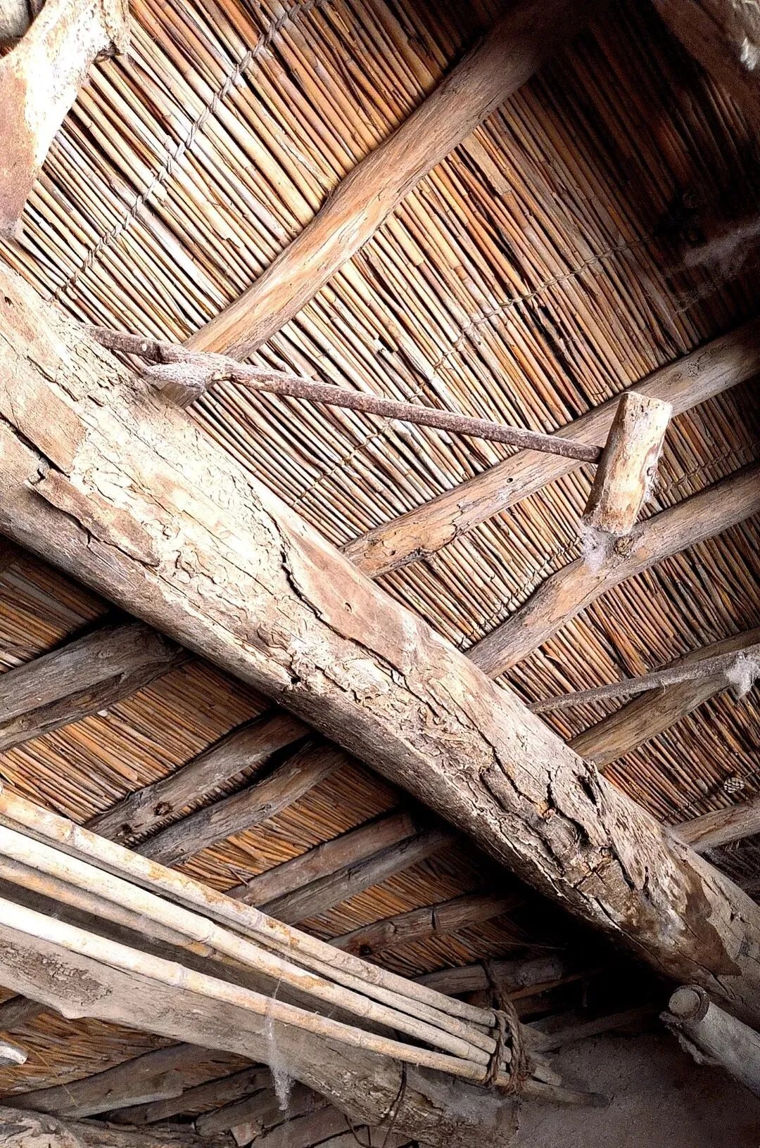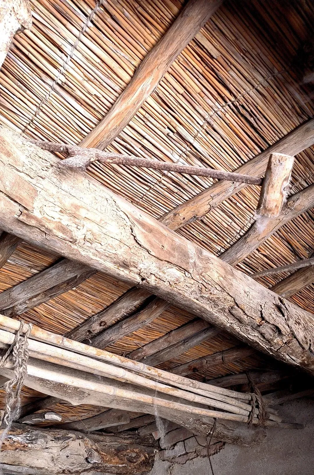 这个位置以前是工具的老窝,锛就常年吊在梁底下,绑一撮麻绳,手一伸能到,急活时不找,随手一拽就下来,屋顶是芦苇杆子密密排着,风从缝里钻过,绳头会轻轻摆,小时候我仰着脖子看半天,猜它像小斧头又不太像,真正拿到手才知道分量在头上,抡起来不靠蛮劲,靠的是顺着木纹的那个角度。