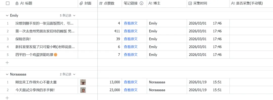 使用场景:发现一个优质对标博主,想研究他的标题风格、选题方向、封面样式,不用一篇篇翻主页、手动保存。打开他的主页链接,点击采集,几分钟就能采集完他的全部笔记,同步到飞书多维表格,快速掌握对方的运营思路。