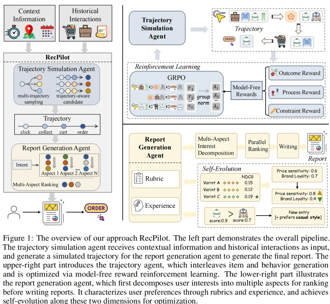 基于这一思路,我们提出了推荐系统的 Deep Research 范式,并设计了相应的多智能体框架 RecPilot 。该工作首次从根本上转变推荐系统的交互界面,实现了传统“以商品为中心的展示列表”向“以用户为中心的决策支持报告”的跨越 。