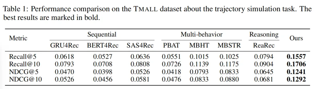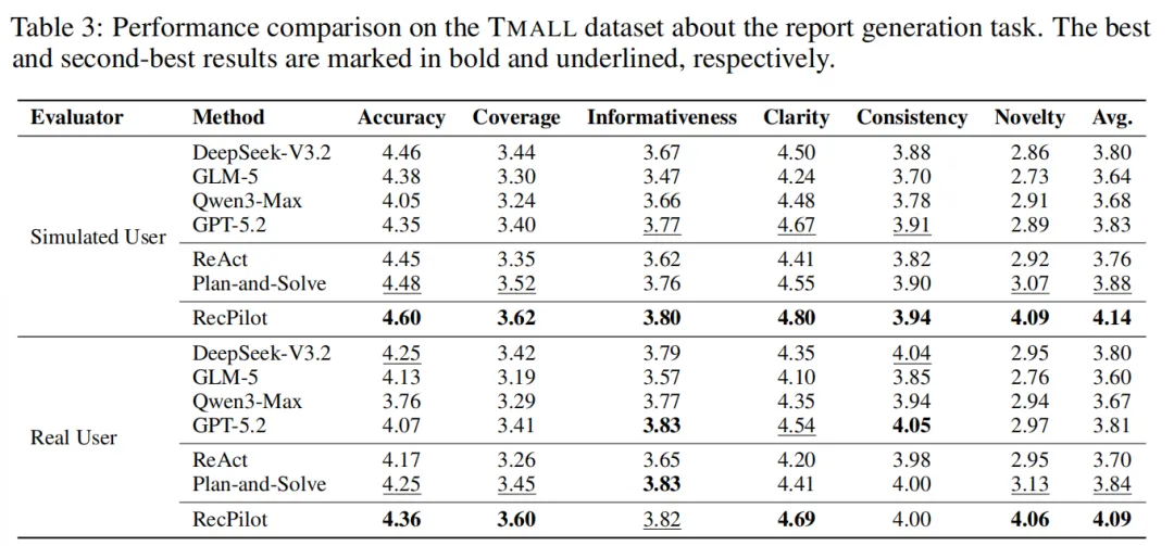 我们在 TMALL 真实交互数据集上对 RecPilot 进行了系统评测,从轨迹模拟能力与报告生成质量两个方面验证方法的有效性。