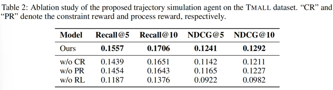轨迹模拟评估: 在预测用户购买行为的任务中,RecPilot 显著优于传统序列推荐(SASRec、BERT4Rec)以及先进的多行为/推理增强推荐基线(如 MBSTR、ReaRec)。进一步的消融实验表明:高质量的用户探索轨迹模拟是提升推荐性能的关键因素。通过显式建模用户从“探索”到“决策”的行为路径,RecPilot 能够更准确地刻画用户意图,从而获得更优的推荐效果。