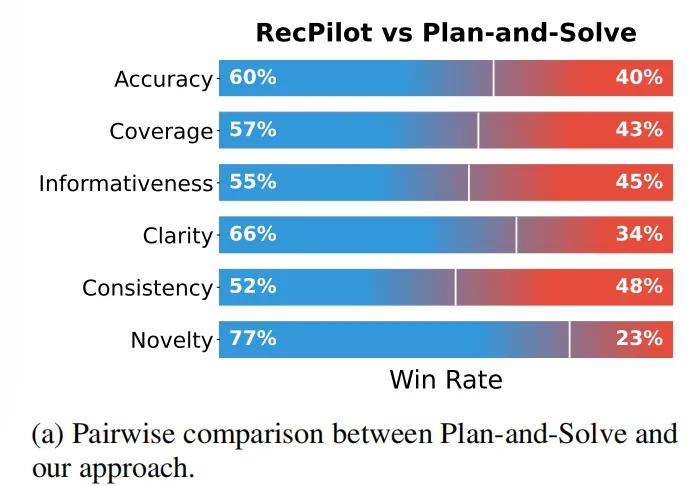 报告生成评估: 引入大模型模拟用户与真人双重盲测,构建了准确性、覆盖率、信息量、清晰度、一致性与新颖性六大指标 。在与 Plan-and-Solve 等强大 Agent 基线的 Head-to-Head 对比中,RecPilot 全面占优,特别是在“新颖性”维度取得了 77% 的显著胜率,证明了其多方面兴趣拆解机制在挖掘潜在长尾兴趣上的优越性 。