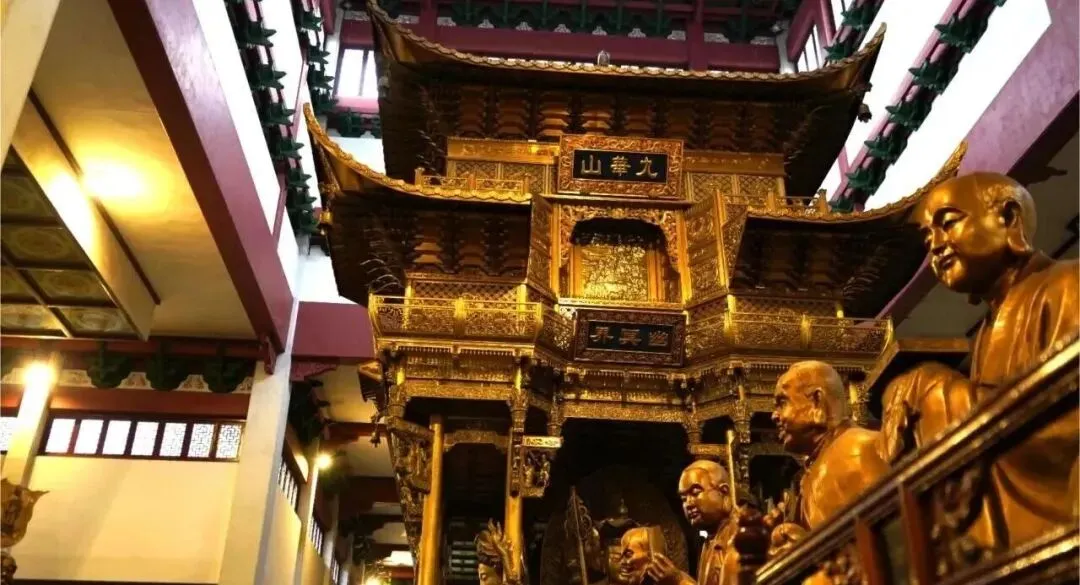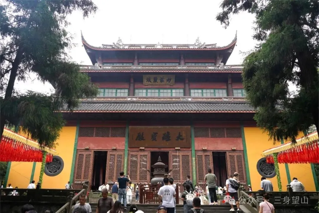 大雄宝殿,原称觉皇殿,单层三叠重檐,长约24米,重檐高33.6米,为第二重大殿。大殿正中是一座高24.8米的释迦牟尼莲花坐像,造像“妙相庄严”、“气韵生动”,颔首俯视,令人景仰,这是中国最高大的香樟木坐式佛像之一,是一件不可多得的宗教艺术精品。正殿两边是二十诸天立像,殿后两边为十二圆觉坐像。大殿后壁有“慈航普渡”、“五十三参”海岛立体群塑,共有佛像150尊,正中为鳌鱼观音立像,手执净水瓶,普渡众生,下塑善财童子及其参拜观音故事,善财童子参拜名师53位,第27参拜观音得道成佛。观音两侧为弟子善财与龙女,上有地藏菩萨,再上面是释迦牟尼雪山修道的场景:白猿献果、麋鹿献乳,整座佛山造型生动。