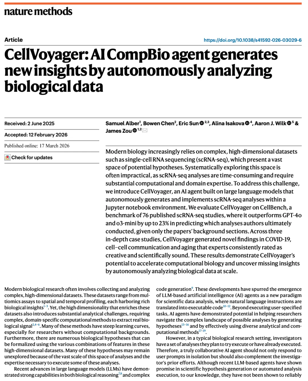 📚 文献引用:Alber, S., Chen, B., Sun, E. et al. CellVoyager: AI CompBio agent generates new insights by autonomously analyzing biological data. Nat Methods (2026).