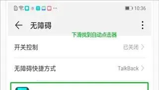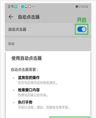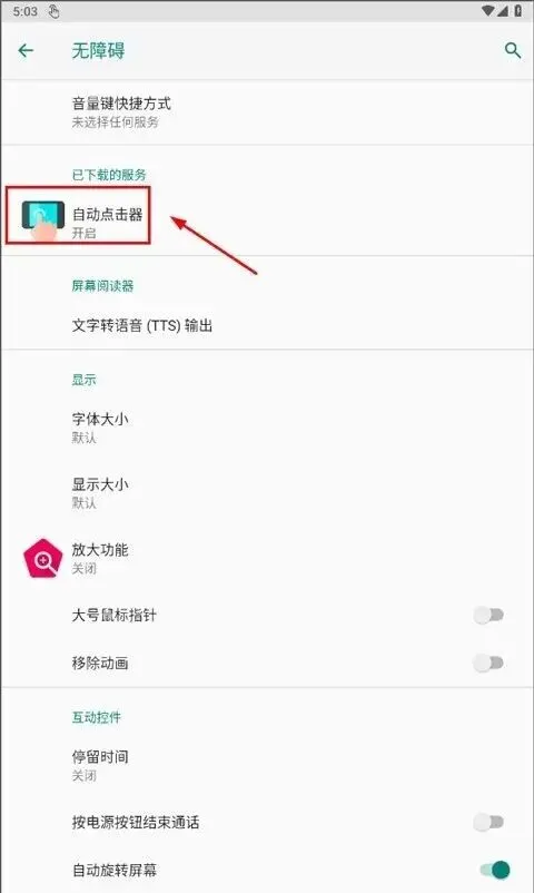 2、进入系统设置后,找到“自动点击器”,并点击进去,选择开启选项。
