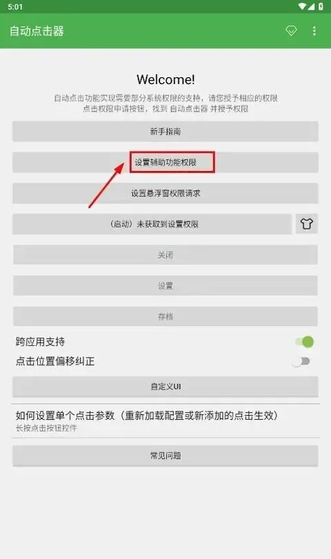 1、首先打开自动连点器app,点击【设置辅助功能权限】;