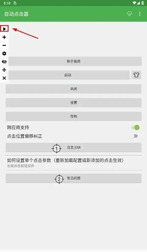 3、点击灰色按钮,开启“自动点击器”,然后回到应用中。