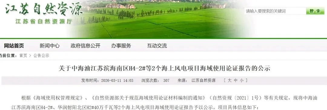 江苏省自然资源厅发布《关于中海油江苏滨海南区H4-2#等2个海上风电项目海域使用论证报告的公示》