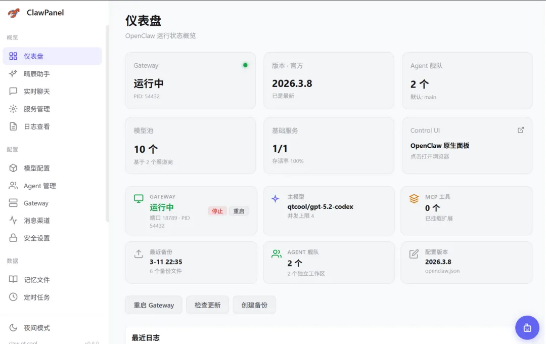 ClawPanel 是一个专为 OpenClaw 设计的可视化管理面板,内置智能 AI 助手。它不仅仅是一个管理工具,更是一个能够理解你的操作意图、提供实时建议、自动执行复杂任务的全能助手。