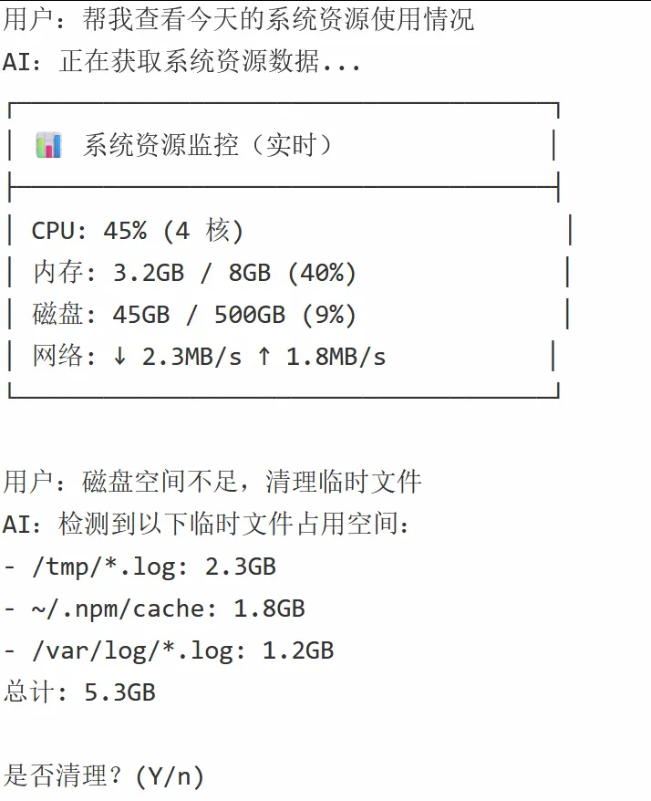 用户:帮我查看今天的系统资源使用情况AI:正在获取系统资源数据...[返回 CPU、内存、磁盘、网络等实时监控数据]用户:磁盘空间不足,清理临时文件AI:检测到以下临时文件占用空间:- /tmp/*.log: 2.3GB- ~/.npm/cache: 1.8GB是否清理?(Y/n)