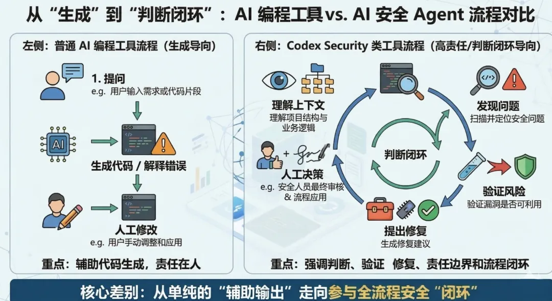 图 3:普通 AI 编程工具更偏向“辅助输出”,而 Codex Security 这类 AI 安全工具更强调理解上下文、验证风险、提出修复,并参与流程闭环。