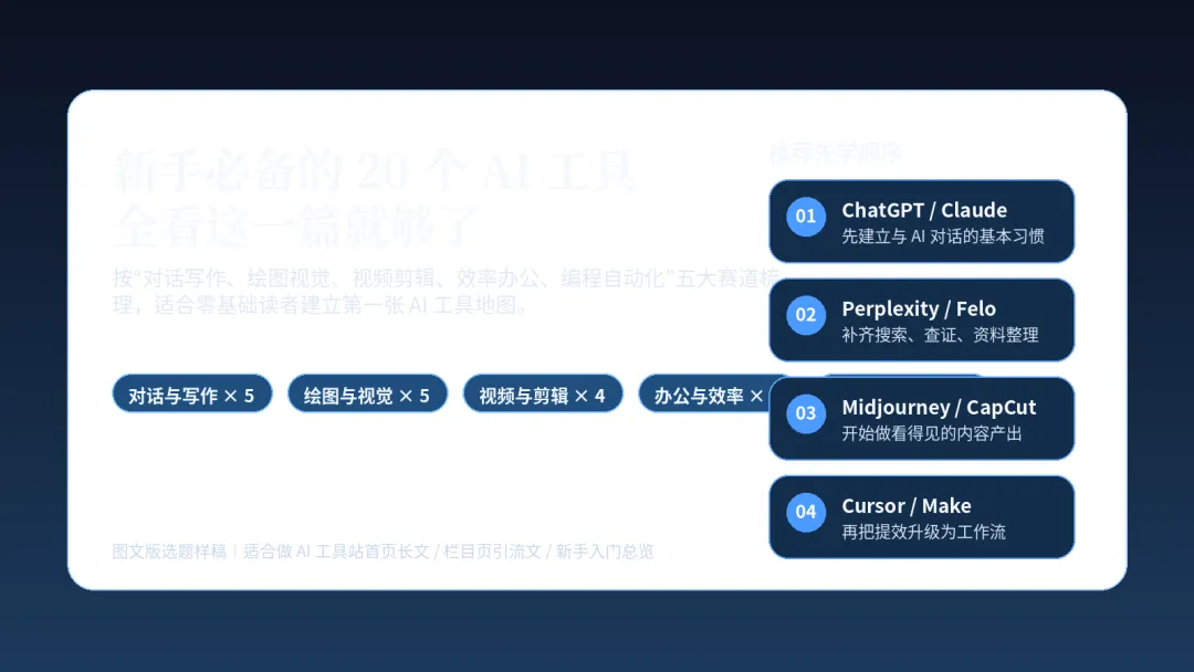 这篇文章适合:刚接触 AI 的新手、准备搭建 AI 工具站的站长、需要快速建立工具认知的内容创作者。你会看到:20 个值得优先了解的工具、五大赛道划分逻辑、不同人群的起步组合,以及更适合零基础读者的上手顺序。 |