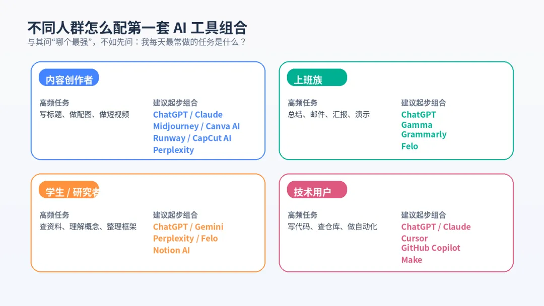 图 3不同人群的第一套 AI 工具组合建议。
