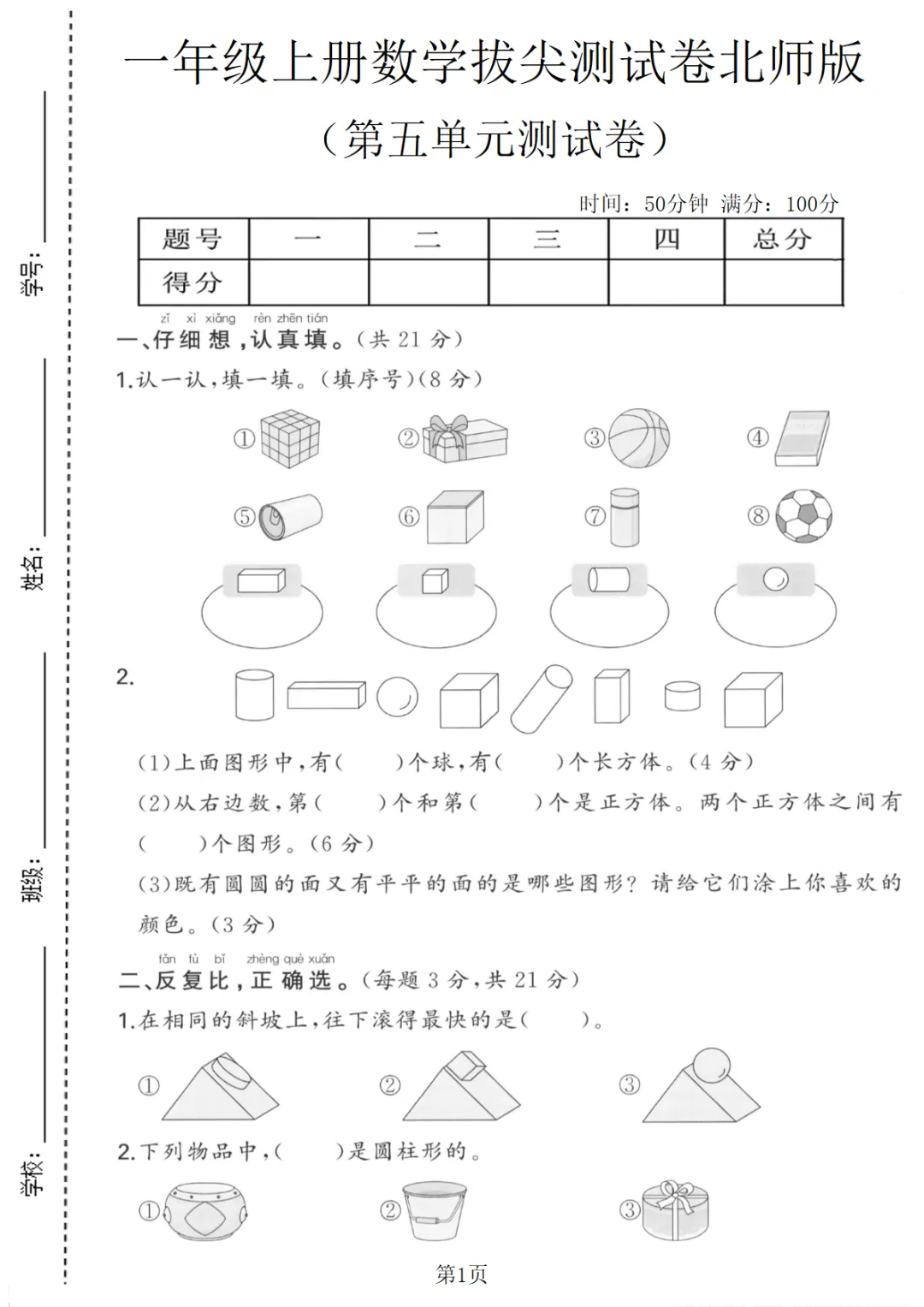 【免费下载】一年级上数学第五单元测试卷《北师版》,PDF电子版,可打印