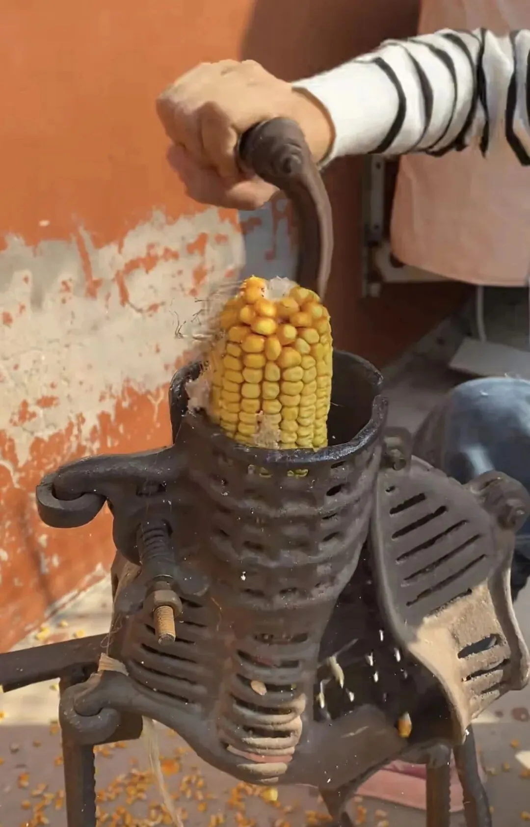 图中这个铁疙瘩就是手摇玉米脱粒机,老铁铸出来,黑丘丘的,一边安着弯把手,另一头开着个小口子,棒子从这头塞进去,手一摇,铁齿轮咯哒咯哒直响,玉米粒就啪啪落下来,芯子被从另一头顶出去,小时候家门口堆一地玉米,爸爸坐着小凳,我在一边看热闹,刚帮撒两下玉米棒,一会就喊累,爸爸嘴里虽说不着急干,手一直没停下,秋收时家里忙成一锅粥,就指着它省大力,现在都改用电动的,老手摇这玩意儿早就变成仓房角落里落灰的摆设。