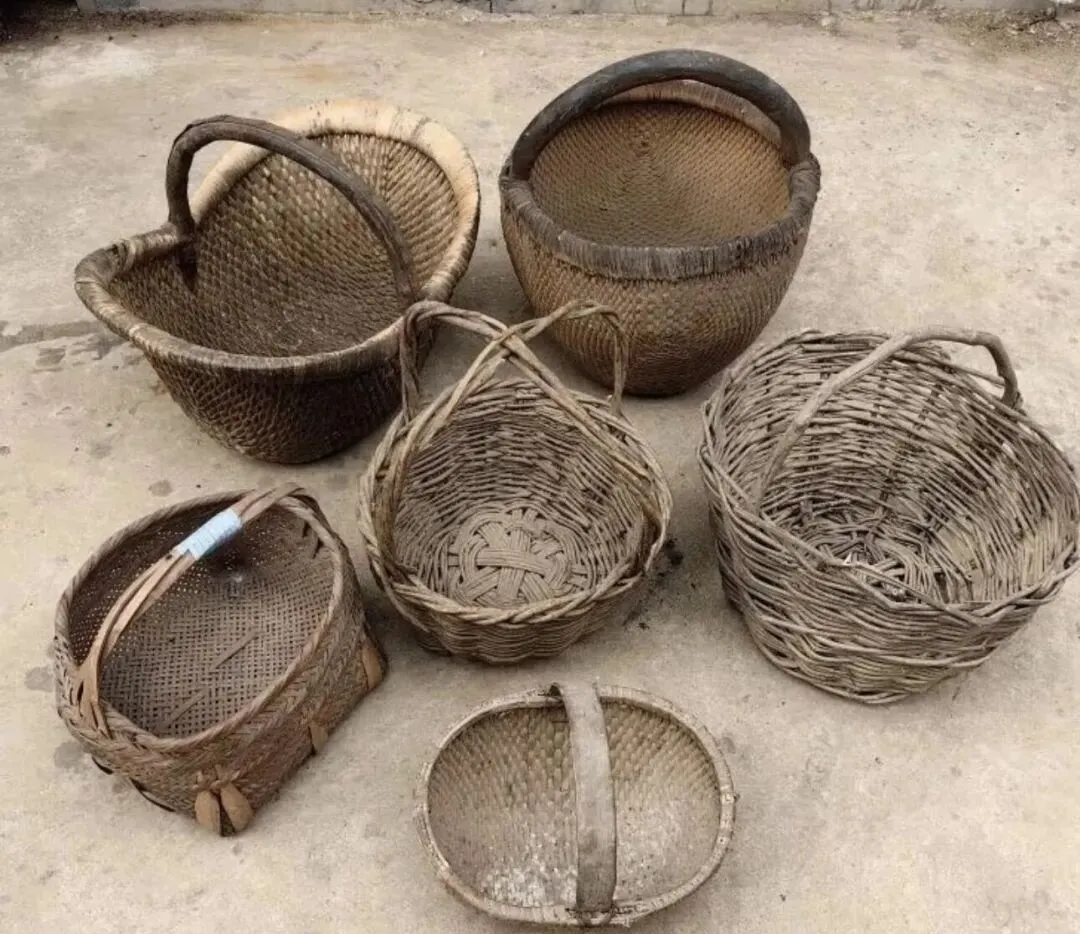 这堆粗藤细篾拧在一块的是竹编大筐,每家院里都得有仨俩,粗布缠把手,为的是提着不搁手,底下特意编得密,土块、野菜、鸡蛋全能放,记得小时候跟着奶奶下地,拎的小筐装满了野苋菜和鸡蛋,肩膀压得硌疼也不肯撒手,老人们进菜园习惯挎在胳膊窝里,瓜果蔬菜一装全带回来,过年时油条麻花也都是用它放高高地挂在仓房顶上,怕耗子爬进去,现在谁家要是还舍得用手编的,得是会过的主儿了。
