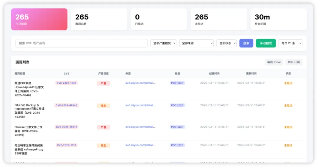- 实时监控状态:查看漏洞库数量、最近更新时间、下次检查时间