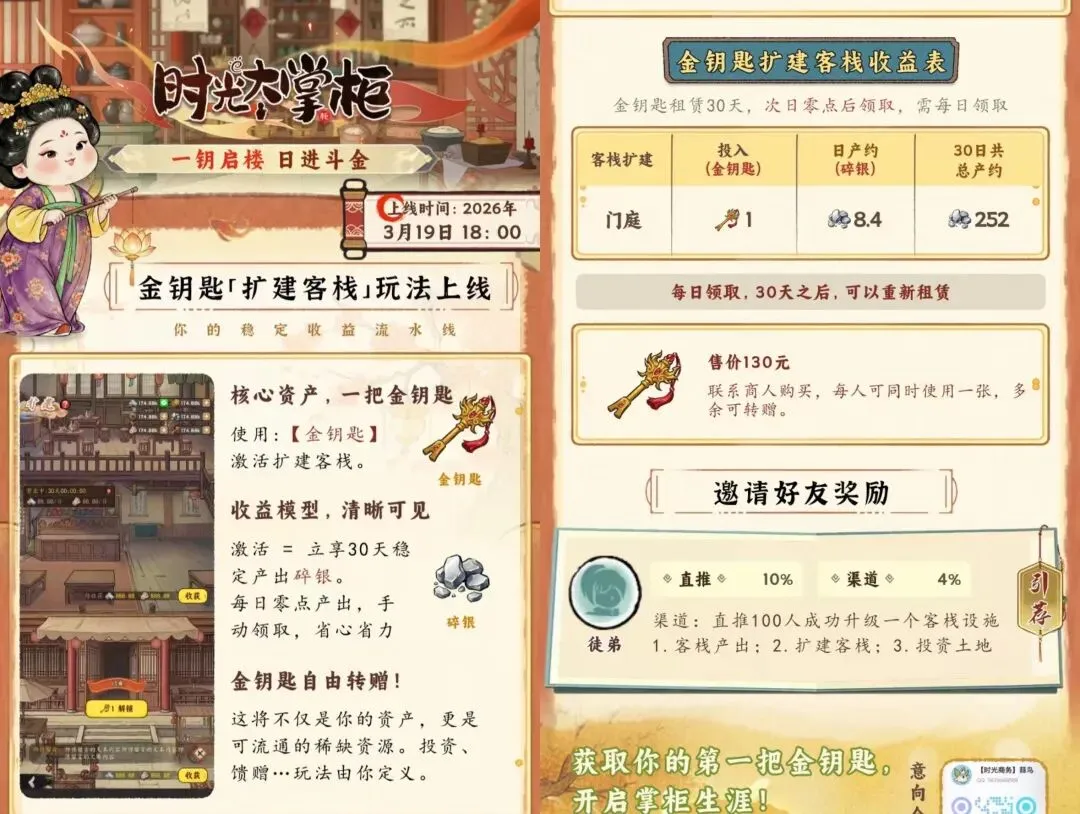 新板块新钥匙3月19上线,零投资撸一个月可以撸到几十块收益,超高收益,第十五天了集市还在一直退市,市场材料供不应求,新上线板块扩建客栈,商业街,金钥匙130一把,可产碎银30天,30日总长252个碎银。252*1.3=327.6世界币,世界币稳定0.5/个