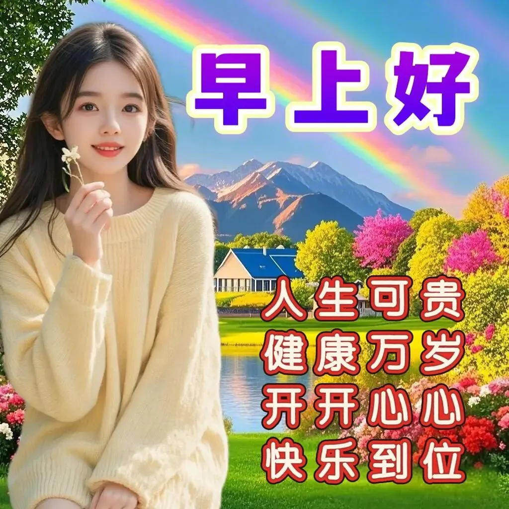 轻轻说声早,心情特别好, 人生一辈子,缘分就是宝, 相互常挂念,健康永不老, 开心每一天。笑问早上好!