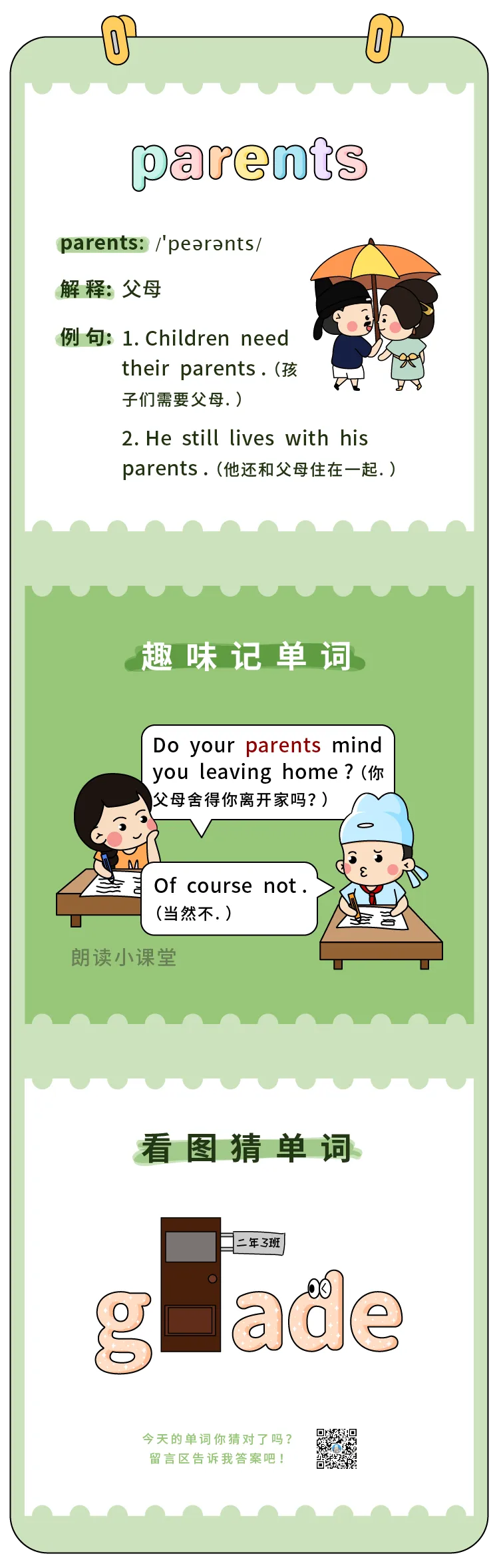 【单词漫画054】 parents(父母) ▲点上方绿标,跟着朗读君,看漫画,学单词 作者丨朗读君 来源丨朗读君英语(id:langdujun170) 更多英语工具 点击下方卡片,学习吧! ▼ 点击下方图片 一起学习【更多单词】 ▼ 学会了在这里集合~