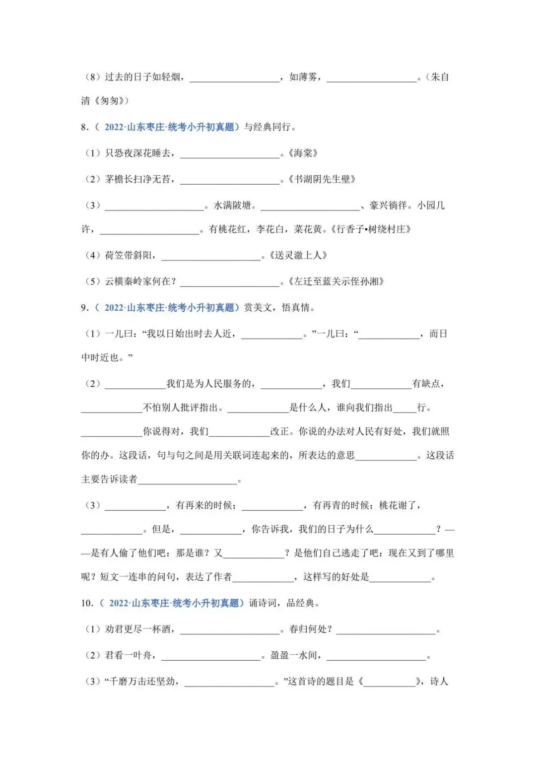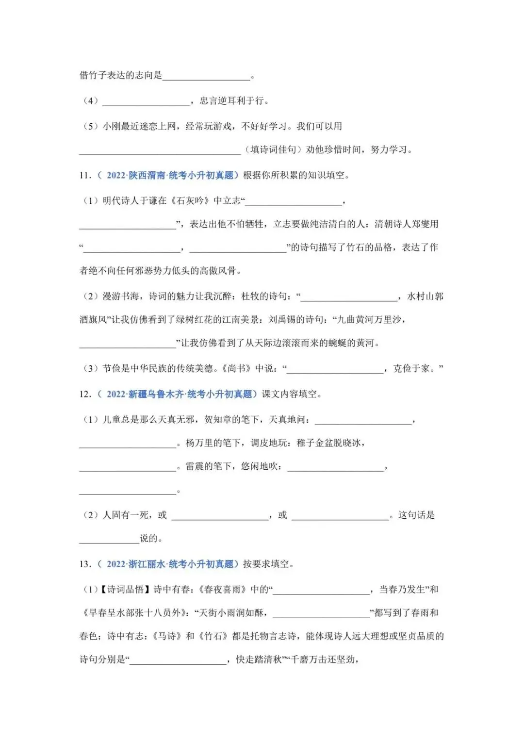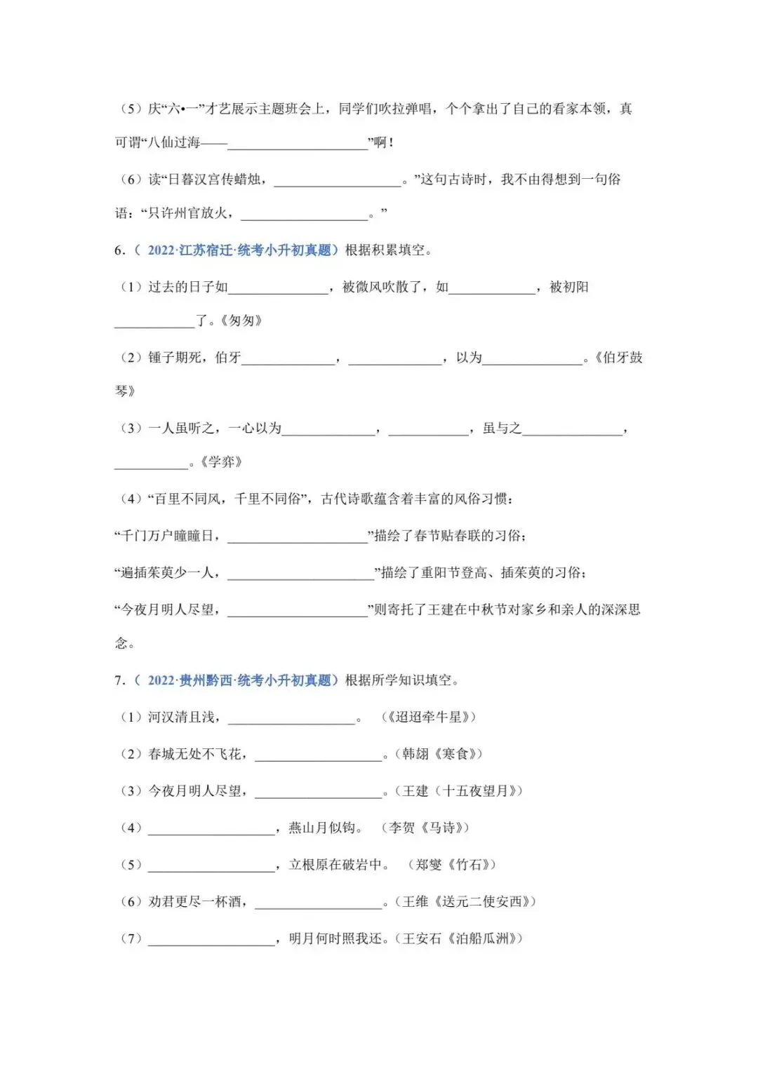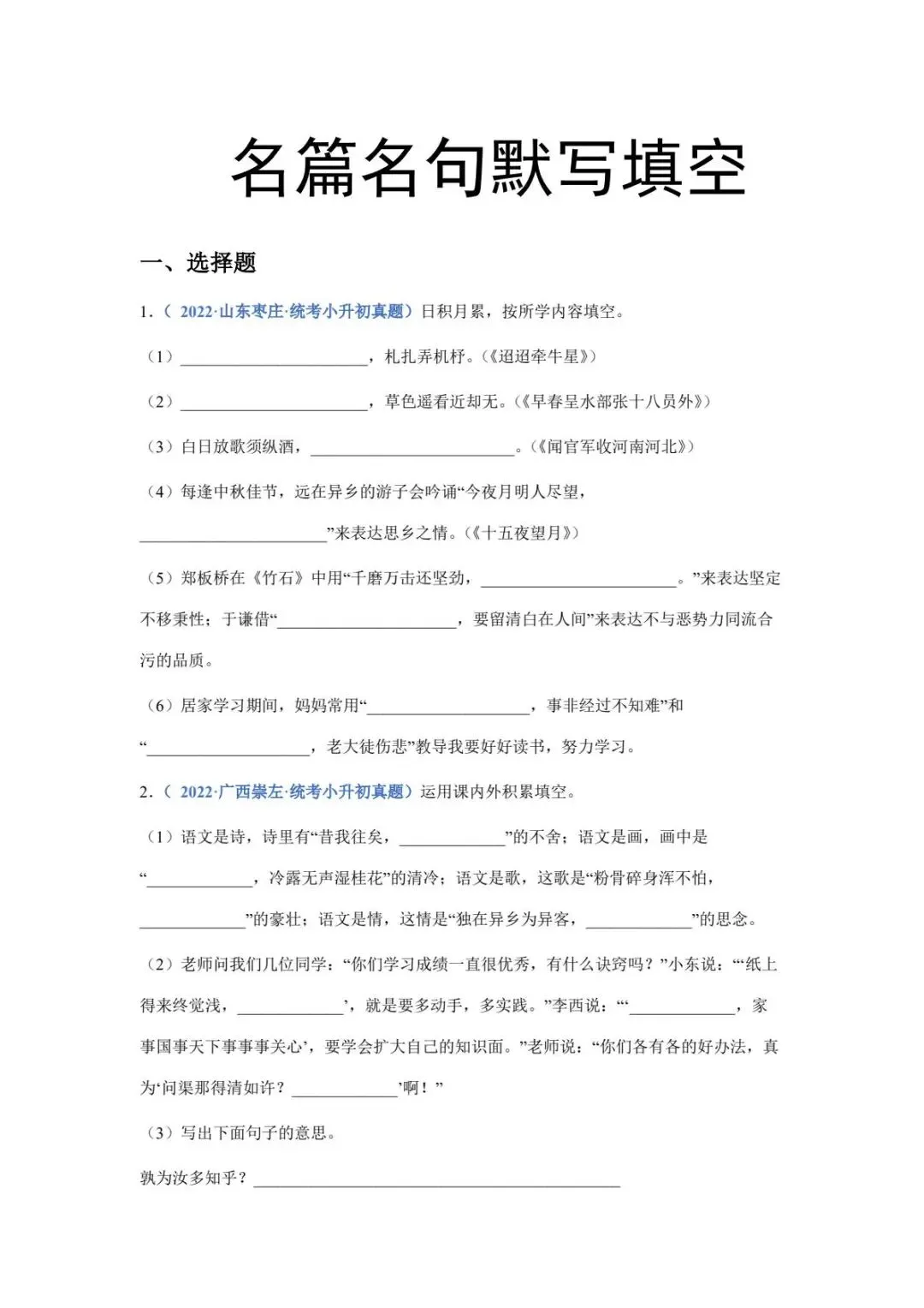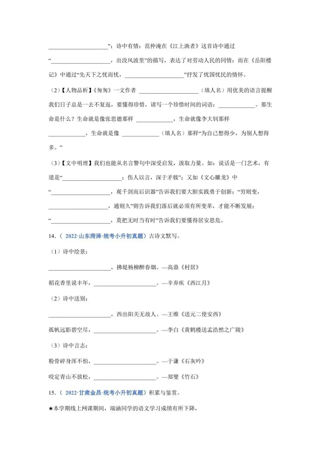 六年级下册语文名篇名句默写填空(电子版可打印附答案)