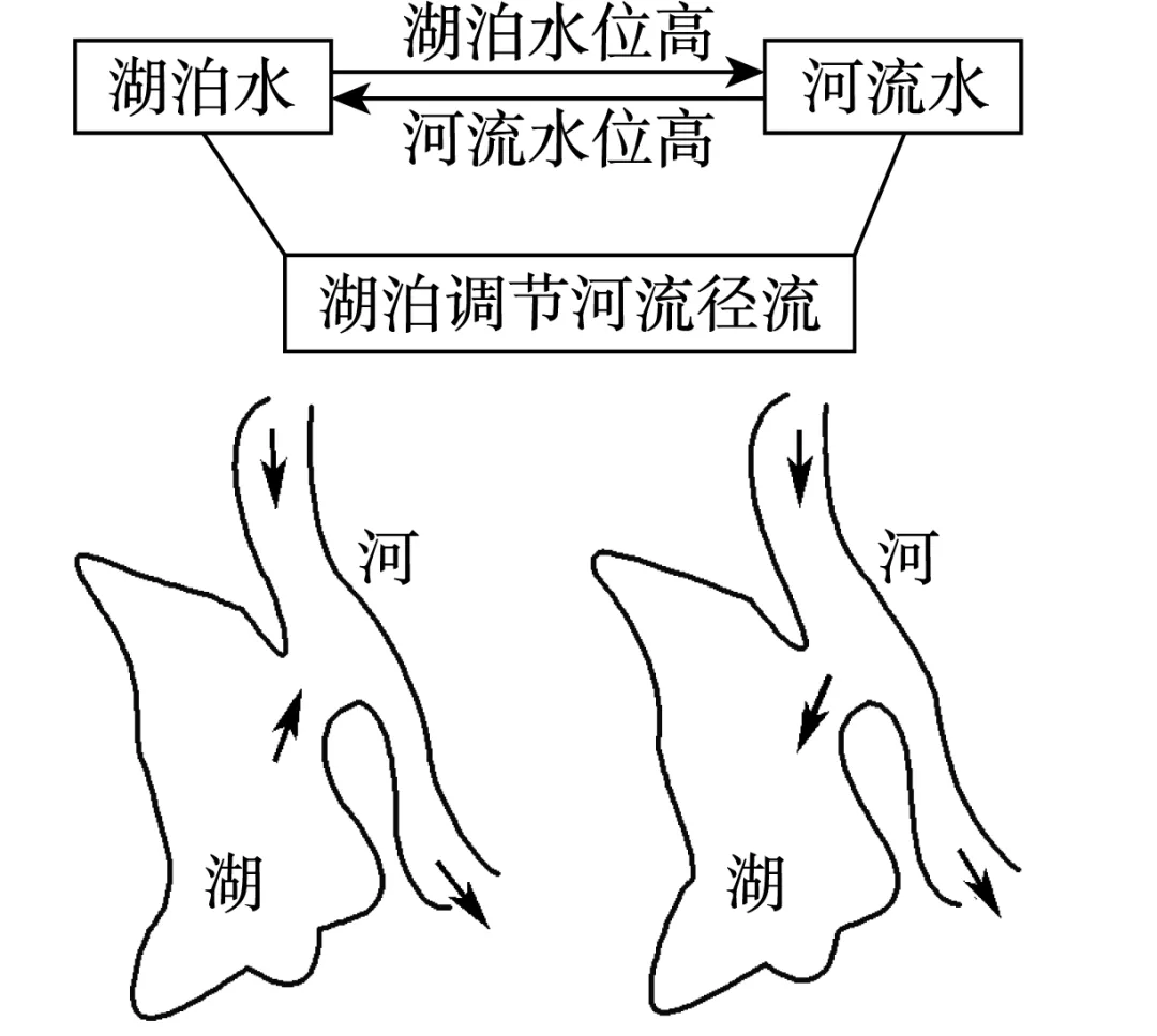 a.位于河流中下游的湖泊,洪水期蓄积部分洪水,削减、延缓干流洪峰,枯水期补给河流,对河流径流起着调节作用。如下图所示: