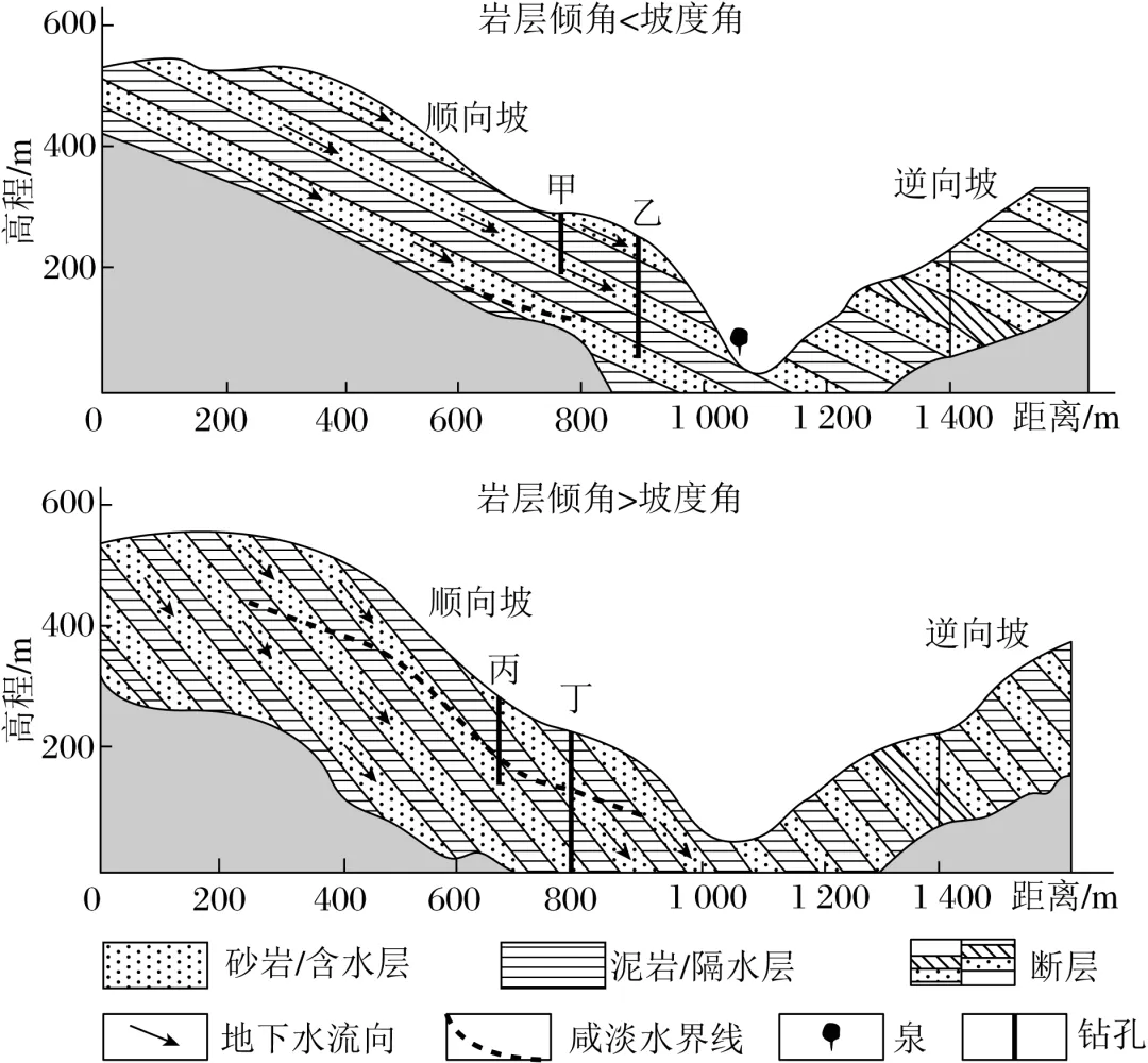 (2024·湖北卷)四川盆地西南缘严重缺水区地下水多咸水。该区砂岩与泥岩(含盐多)交替分布,具有“丘坡补给、谷地排泄”的特点。研究发现,地下水排泄条件好,盐分不易积累,发育淡水;反之则发育咸水。下图示意不同丘坡地下水排泄条件。据此完成(1)~(3)题。