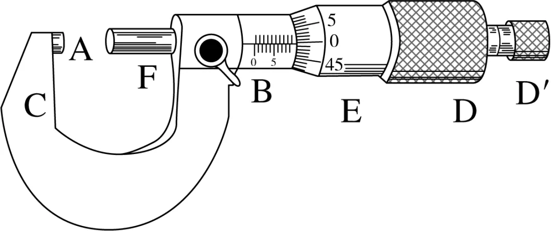 (2)原理:固定刻度B的螺距为0.5 mm,即旋钮D每旋转一周,测微螺杆F前进或后退0.5 mm,而可动刻度E上有50个等分刻度,每转动一小格,测微螺杆F前进或后退0.01 mm,即螺旋测微器的精确度为0.01 mm。读数时估读到毫米的千分位上,因此螺旋测微器又叫千分尺。