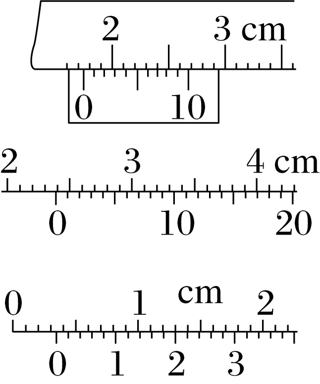 题图最下面游标卡尺:主尺读数为3 mm,游标尺读数为10×0.02 mm=0.20 mm,最后结果是3 mm+0.20 mm=3.20 mm。