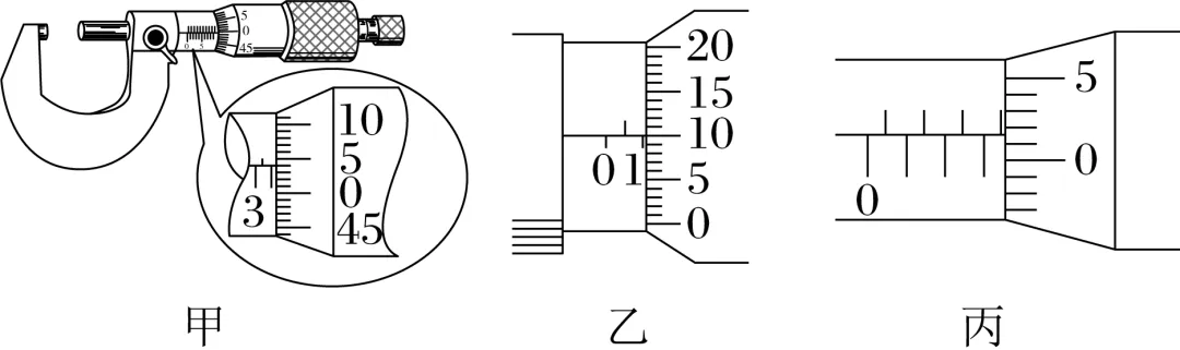 (2)读出下面各螺旋测微器的读数,甲:4.040 mm,乙:1.100 mm,丙:3.515 mm。