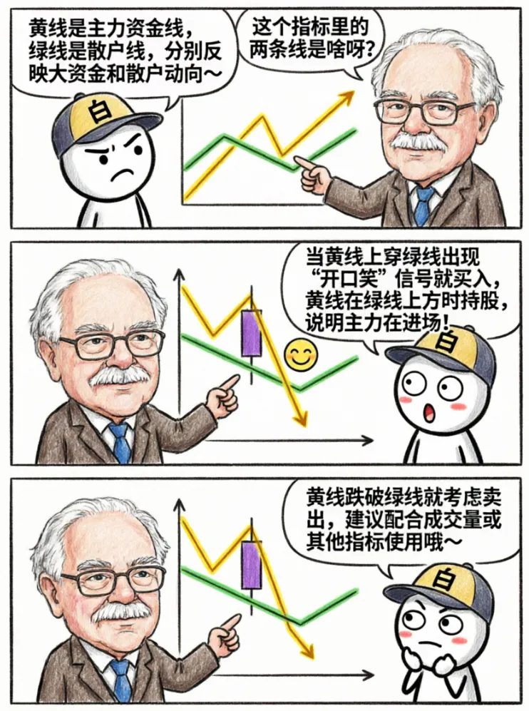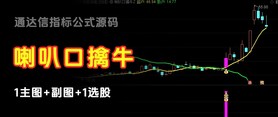 源码【喇叭口擒牛】识别主力与散户资金的博弈 | 主图+副图+选G | 通达信指标公式套装