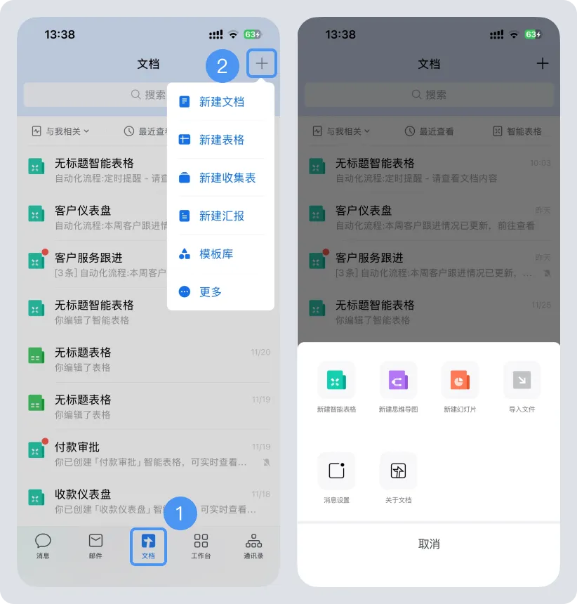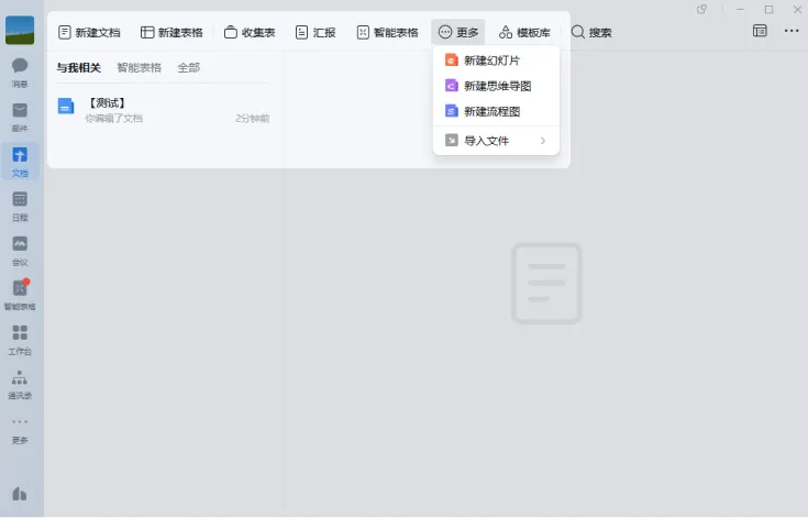 【手机端->文档->右上角+ 】支持创建文档,点击“更多”还可新建智能表格、思维导图、幻灯片类型的在线文档。